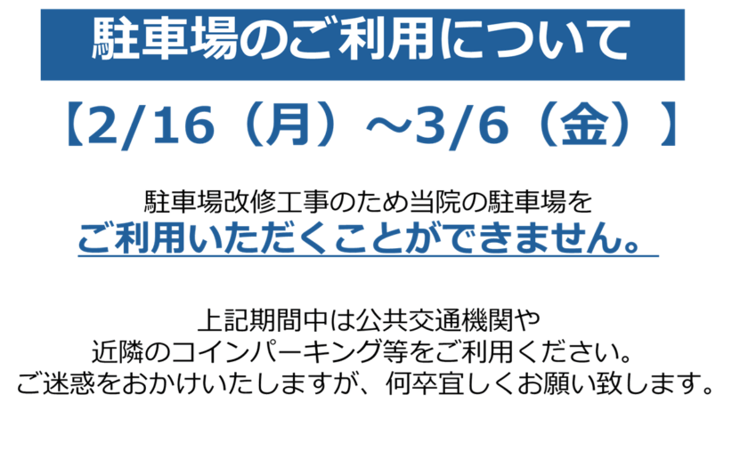 【2/16~3/6】患者様用駐車場・一時利用停止のお知らせ